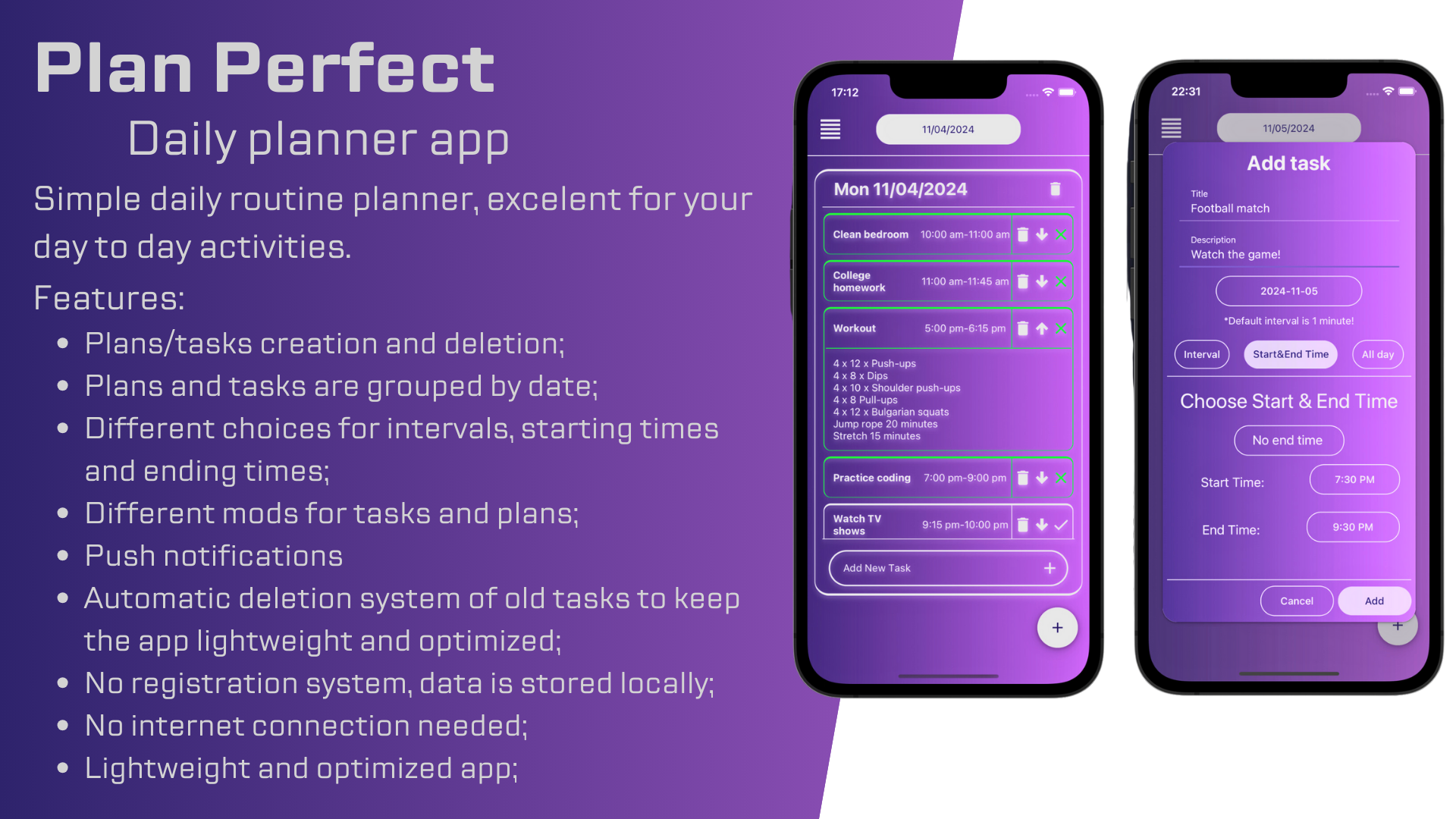 My most recent app I deployed on iOS Appstore. It's an app that i needed for my day to day activities. Created with React-Native, it's a very lightweight and optimized RN App that does not require internet connection. Features: Plans management, automatic deletion systems, push notifications and much more!